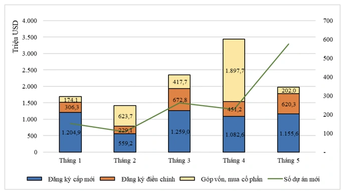 Trong số 53 quốc gia và vùng lãnh thổ có dự án đầu tư được cấp phép mới tại Việt Nam trong 5 tháng đầu năm 2023, Singapore là nhà đầu tư lớn nhất với 1,73 tỷ USD, chiếm 32,9% tổng vốn đăng ký cấp mới; tiếp đến là Trung Quốc 1,1 tỷ USD, chiếm 20,6%; đặc khu hành chính Hồng Kông (Trung Quốc) 552,3 triệu USD, chiếm 10,5%; Đài Loan 499,9 triệu USD, chiếm 9,5%; Nhật Bản 317,7 triệu USD, chiếm 6%.