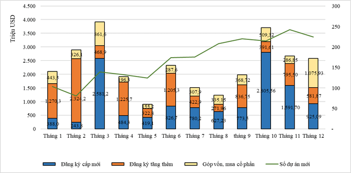 Kết quả thu hút vốn FDI theo các tháng trong năm 2022. Nguồn: Bộ KH-ĐT