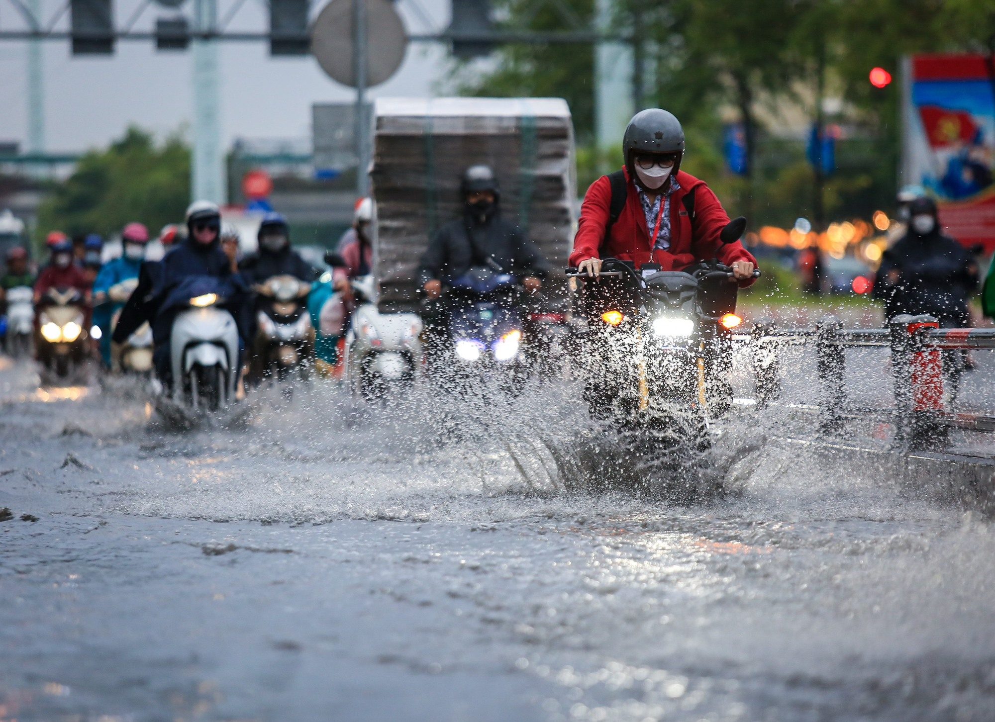 16 giờ 45 trời đổ cơn mưa tầm tã, nhiều người bật đèn xe khi di chuyển.