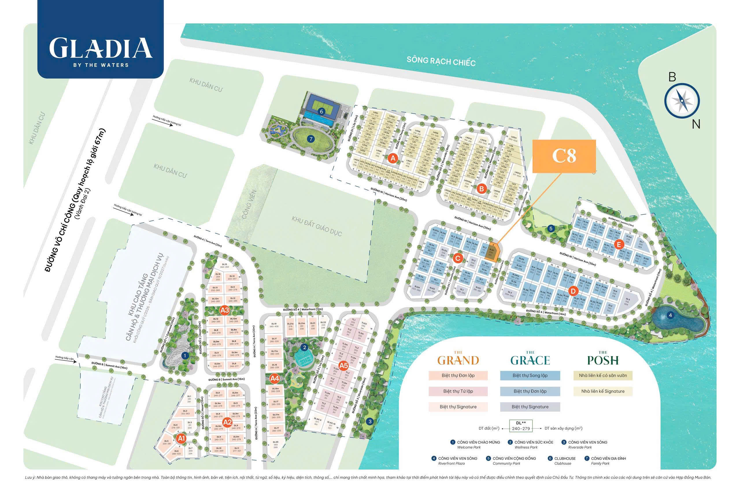 Trục xương sống kết nối tiện ích nội khu: Clubhouse – Khu đất giáo dục – Công viên cộng đồng – Công viên ven sông.
