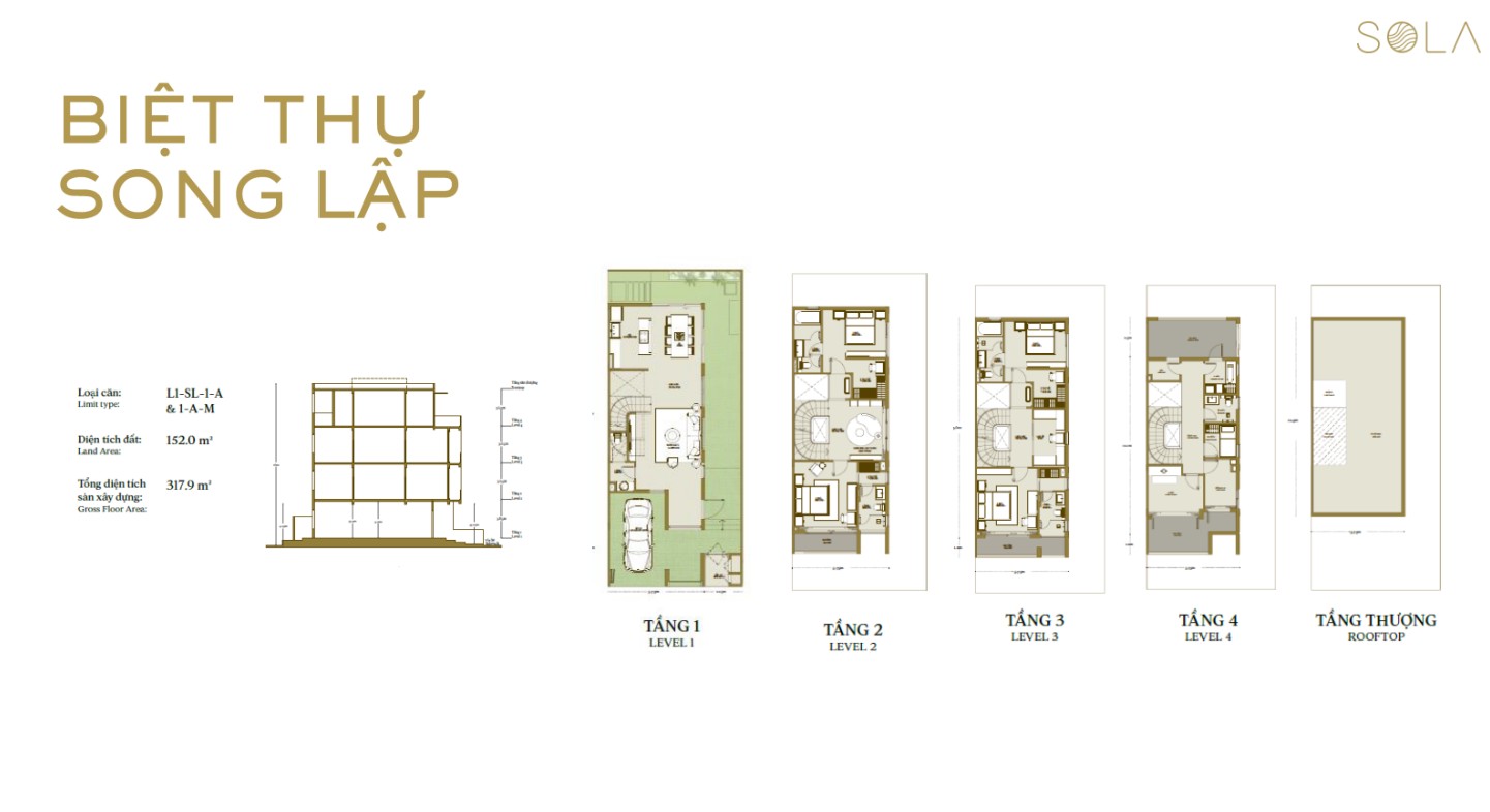 Mỗi căn biệt thự tại SOLA The Global City được thiết kế theo phong cách hiện đại, hòa quyện giữa kiến trúc tinh tế và không gian xanh mát. Với diện tích linh hoạt từ 337.7m² – 691.4m², biệt thự gồm 1 trệt, 4 lầu và sân thượng, mang đến không gian sống rộng rãi, tiện nghi. Đây không chỉ là lựa chọn hoàn hảo cho an cư mà còn là kênh đầu tư tiềm năng, đáp ứng nhu cầu nghỉ dưỡng đẳng cấp ngay giữa lòng đô thị sôi động.